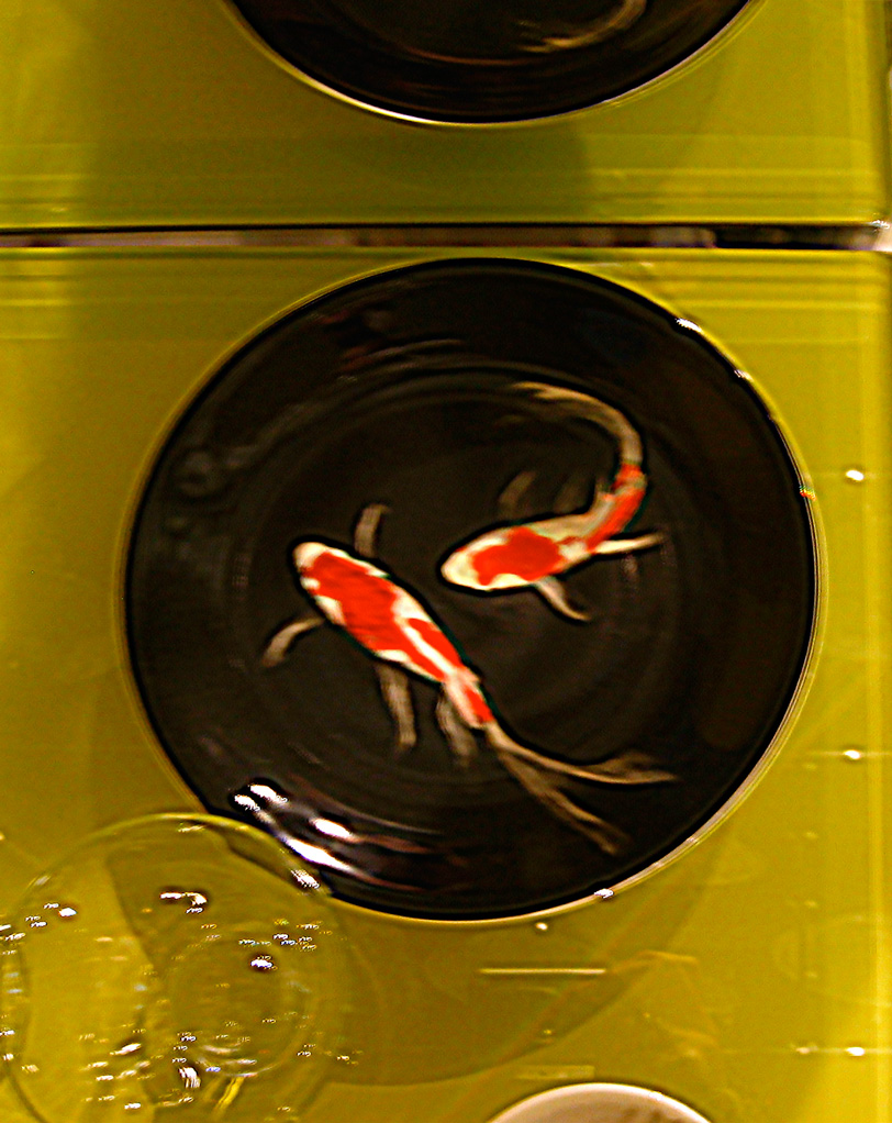 Nothing could have been more appropriate for the glamour of Paola Lenti’s exhibition, than the little “Luciola” produced by Davide Groppi. Inside a transparent jar and activated by moving (tapping on the top) a led firefly wakes up, jumping randomly and flashing a pale purple delicate light.