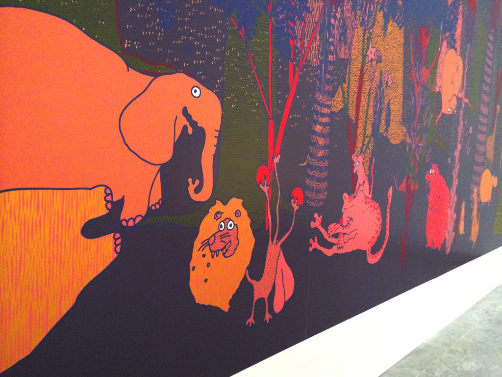 Unique mural inspired by the 1974 documentary Animals are Beautiful People in which different animals live harmoniously in a lush oasis, occasionally becoming intoxicated on fermented marula fruit. The unabashed illustrations are enhanced by being printed in equal value colours; their vibrant, neon tones almost appear grey when one squints. A final flourish comes in the use of glow-in-the-dark ink.